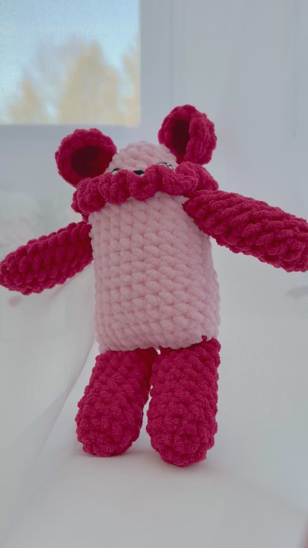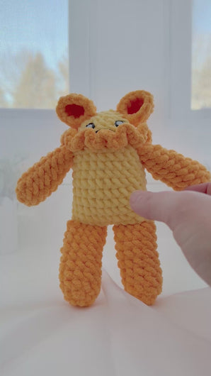 Bartolo is made with a polyester blanket or chenille yarn that provides a soft yet durable feel that can stand up to fidgeting interactions. Bartolo usually comes with two 12mm safety eyes