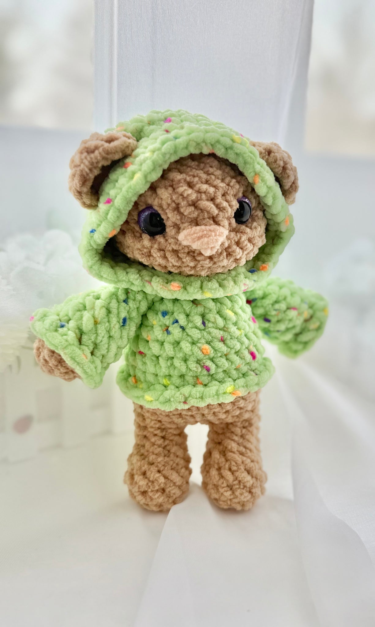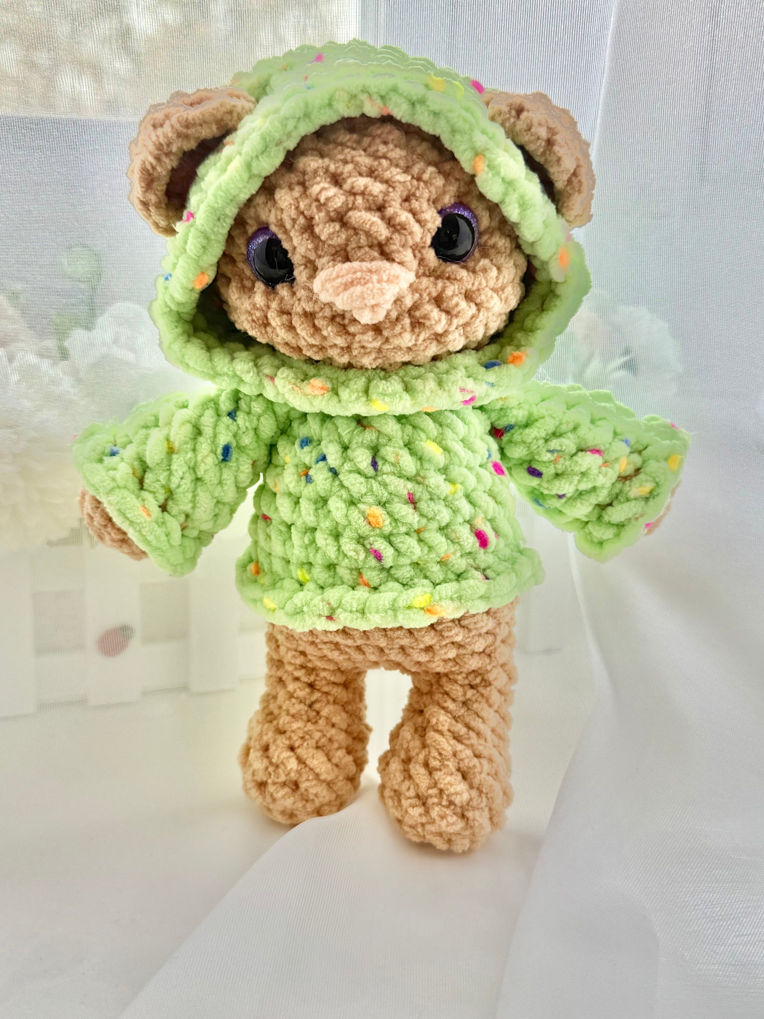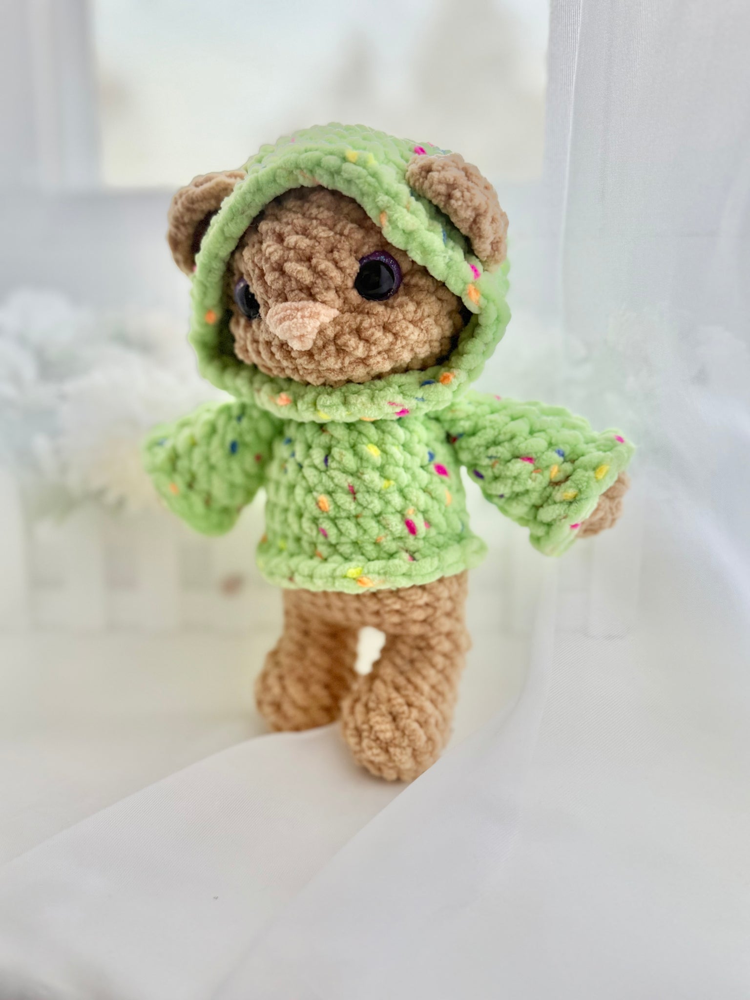 This item was developed from the No Sew Hoodie Bears pattern by the amazing Nooks Hooks. If you are a fellow crocheter wanting the pattern, please check out their Etsy page for the pattern here: No Sew Hoodie Bears.