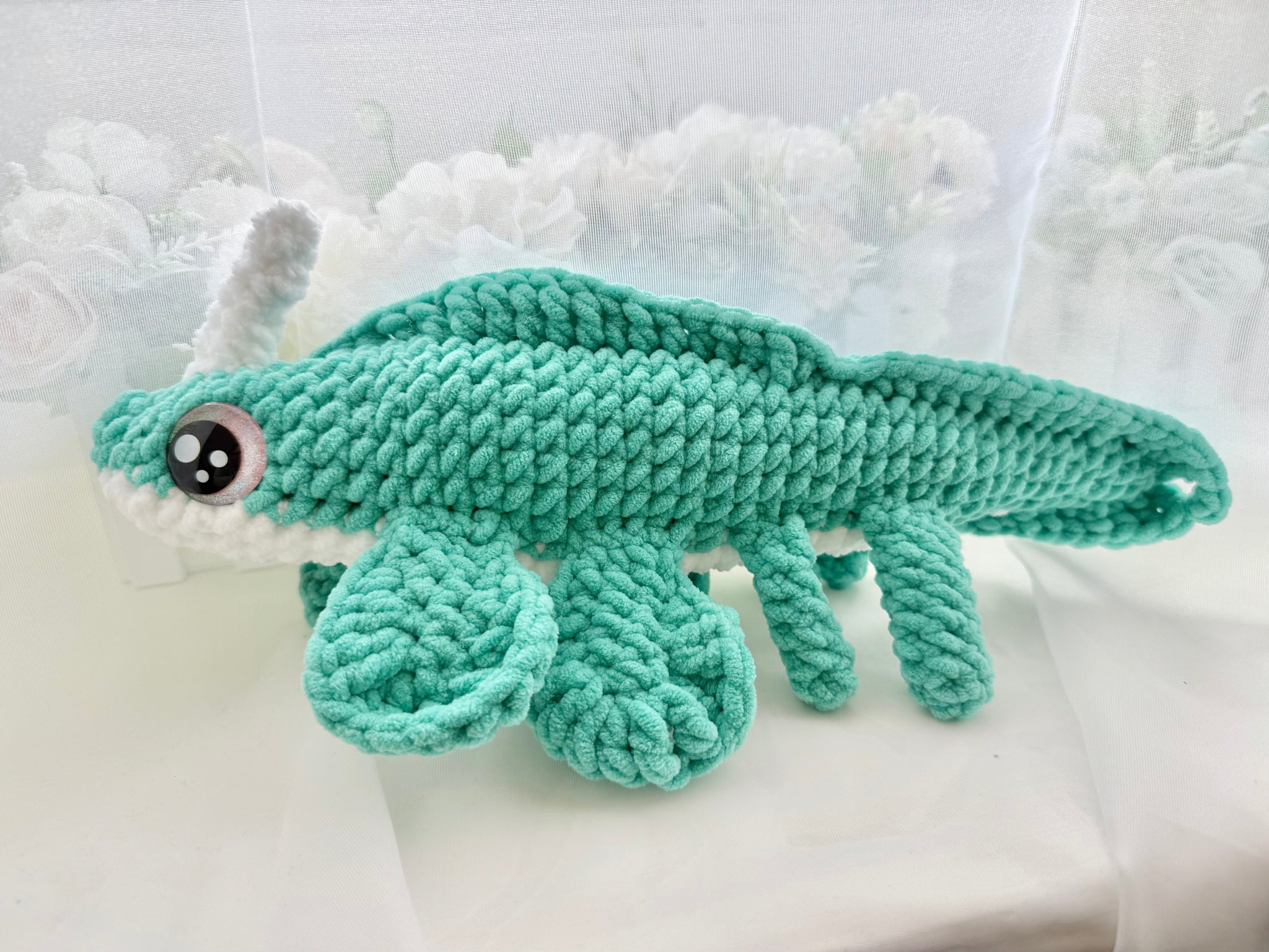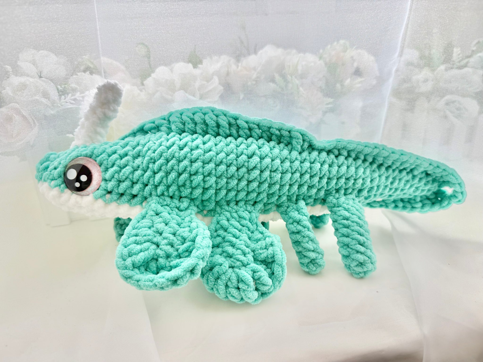This item was developed from the Xenthacanthus pattern by the amazing Yarnaholicsewciopath. If you are a fellow crocheter wanting the pattern, please check out their Etsy page for the pattern here: Xenacanthus Pattern